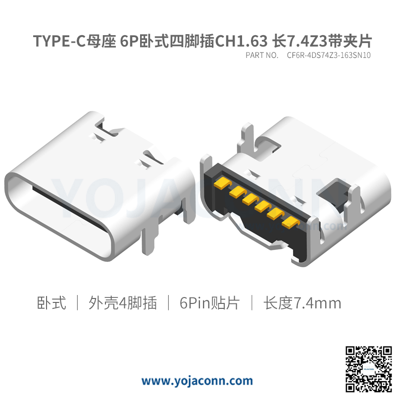 TYPE-C母座 6P卧式四脚插CH1.63 长6.5Z3带夹片
